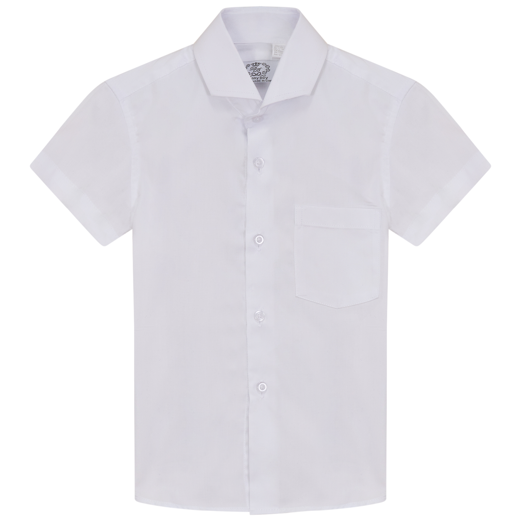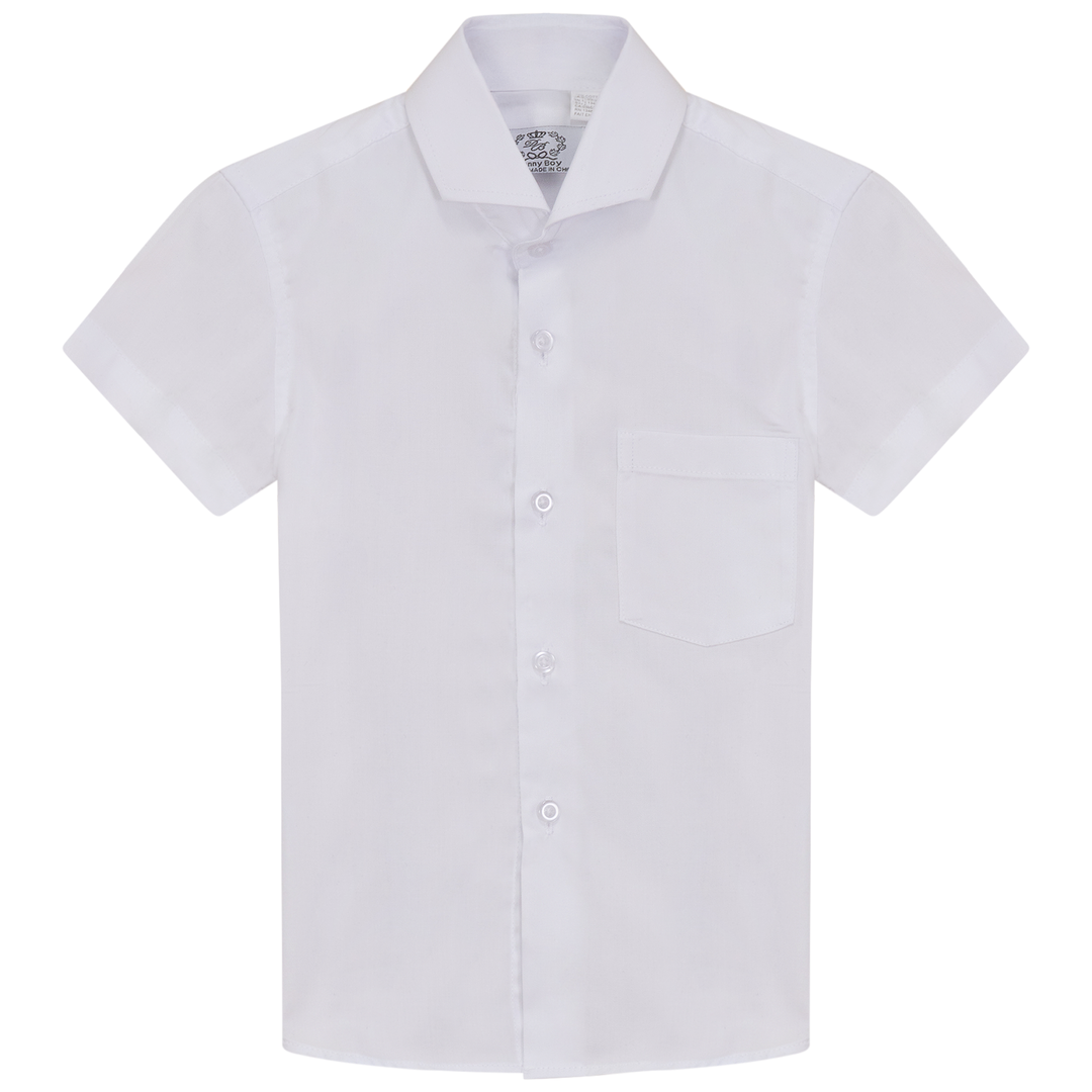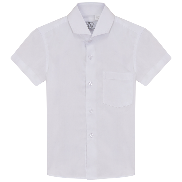 Boys cotton woven top with short sleeves, collar, and placket at center front placket, stand collar, sleeve opening slit and cuffֲ