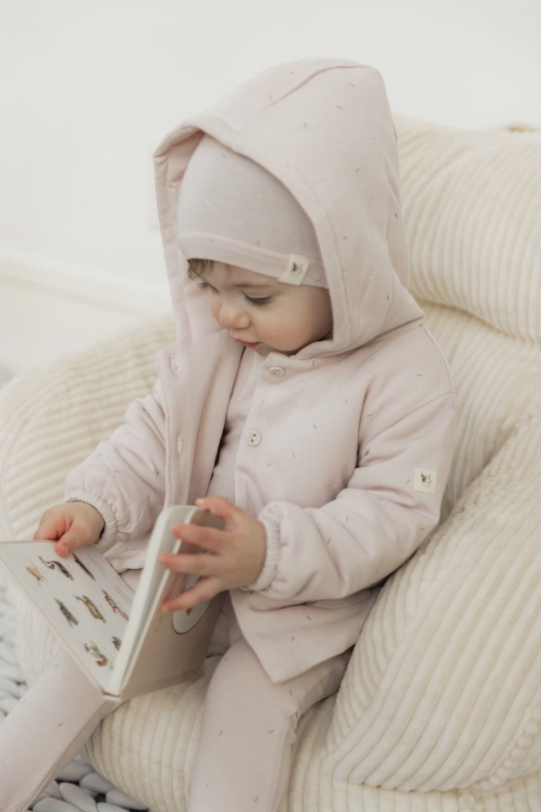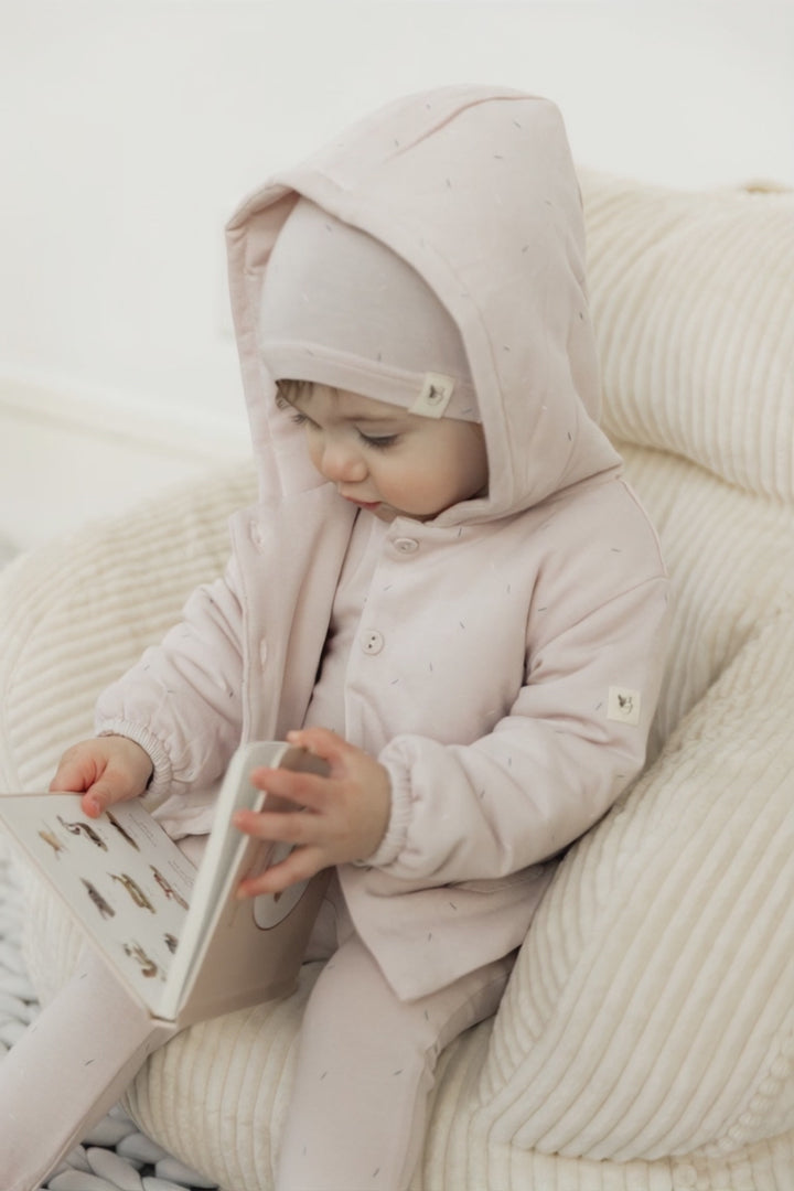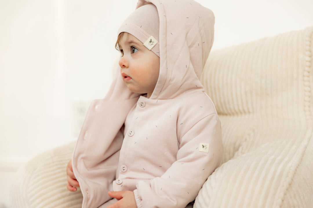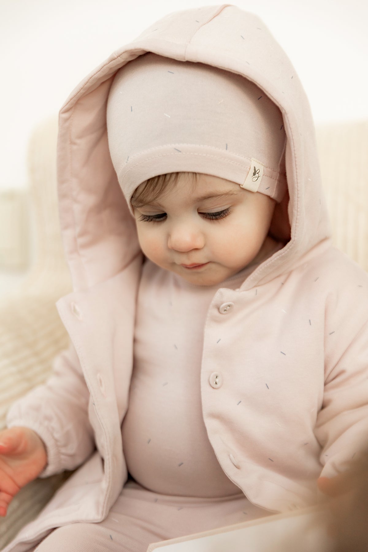 Baby boys and baby girls allover sprinkle print jersey onesie with center back snap opening and elastic at back ankle with a matching hat.ֲ