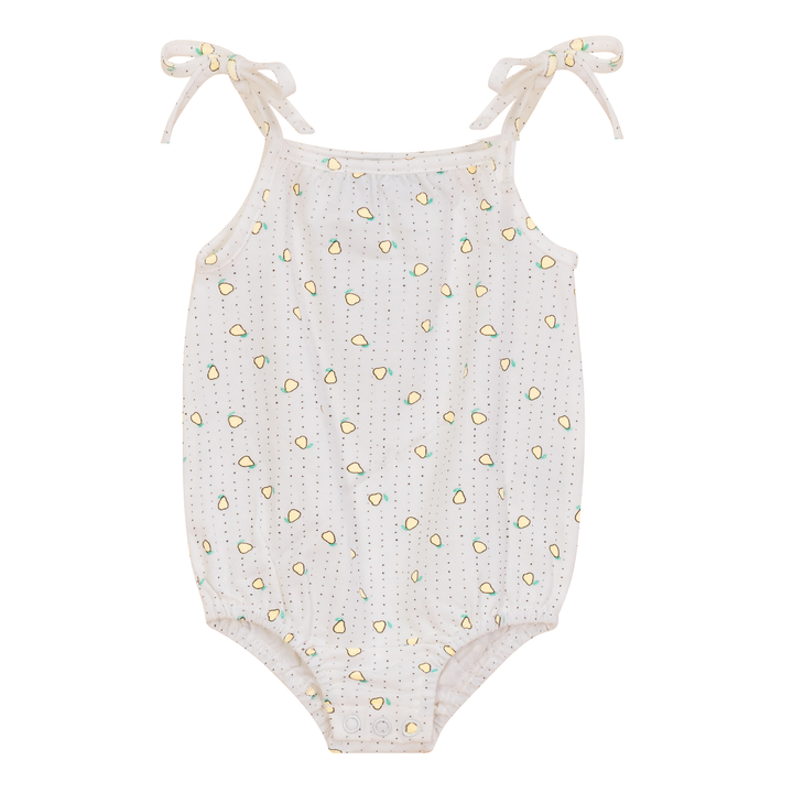 Baby girls cotton spandex romper with allover strawberry pear print,snaps at bottom and elastic at leg opening with straps tie at shoulder. ֲ
