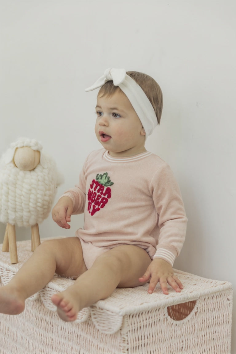 Baby girls long sleeve cotton terry striped trim onesie with center front hook stitch strawberry , snaps at back opening and bottom with elastic at leg opening. ֲ