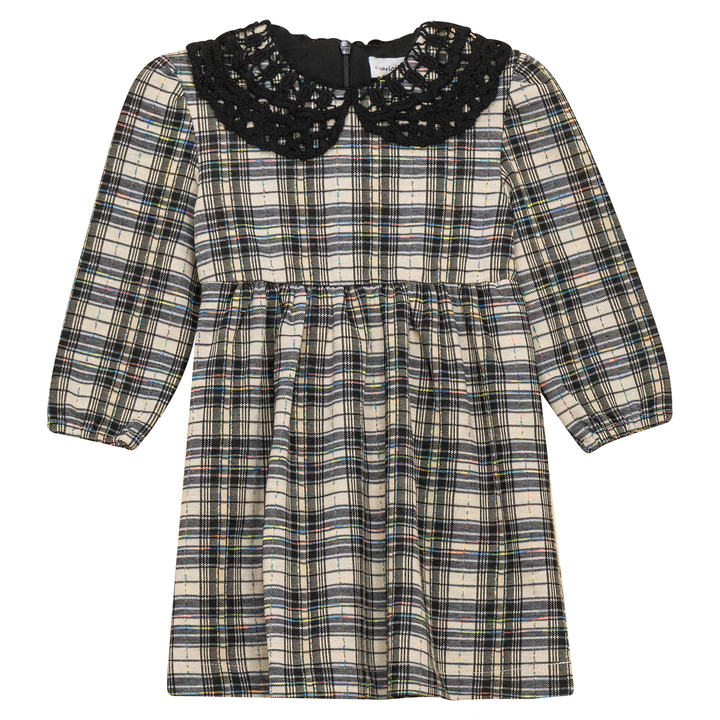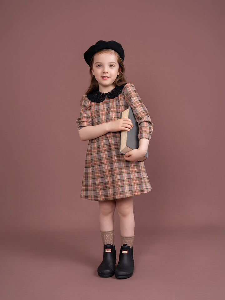 Girls long sleeve stretch plaid high waist dress with crochet collar,center back invisible zipper and elastic at cuffs. ֲ