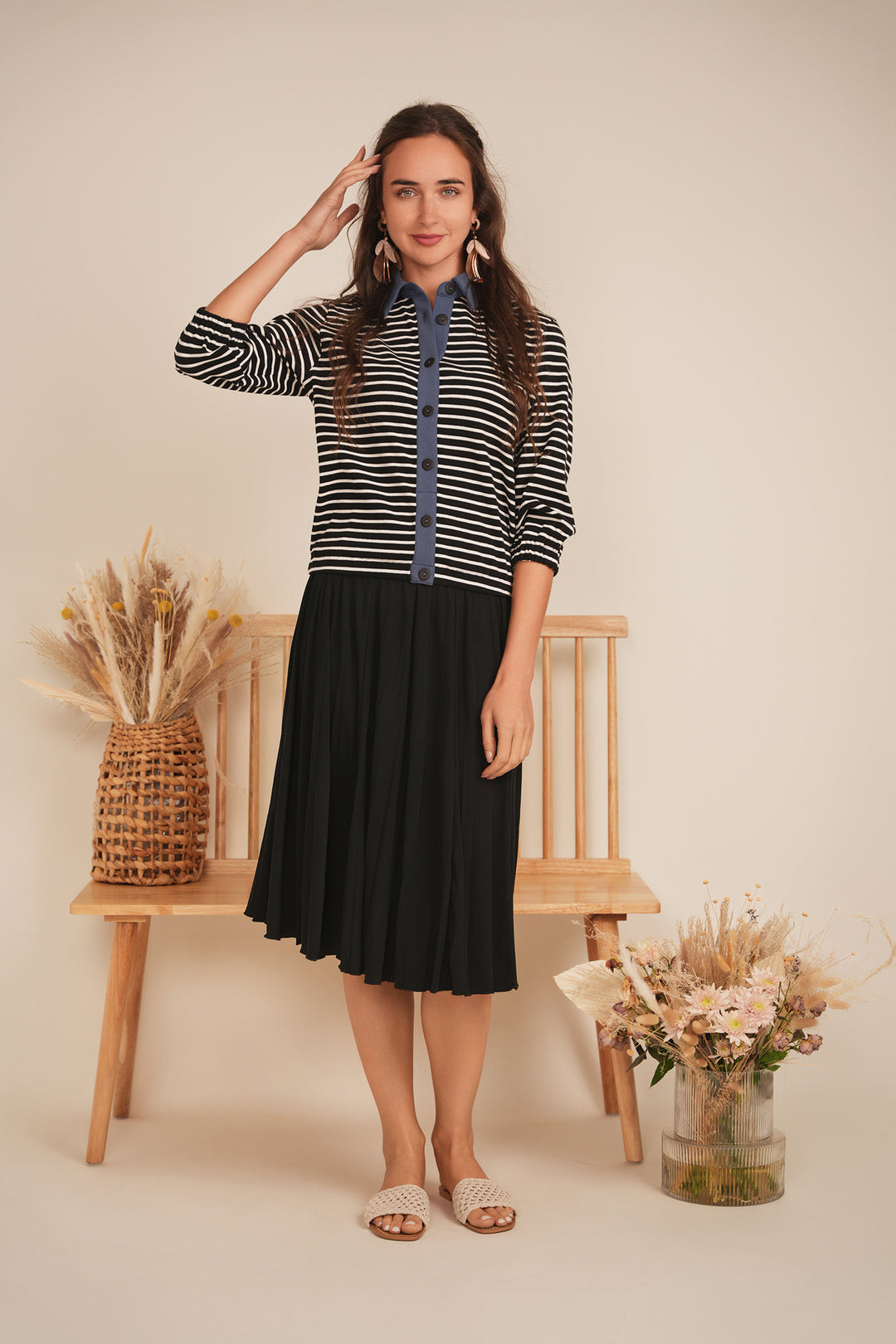 Ladies long sleeve striped button down cardigan with contrast placket. ֲ