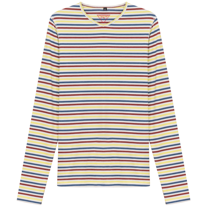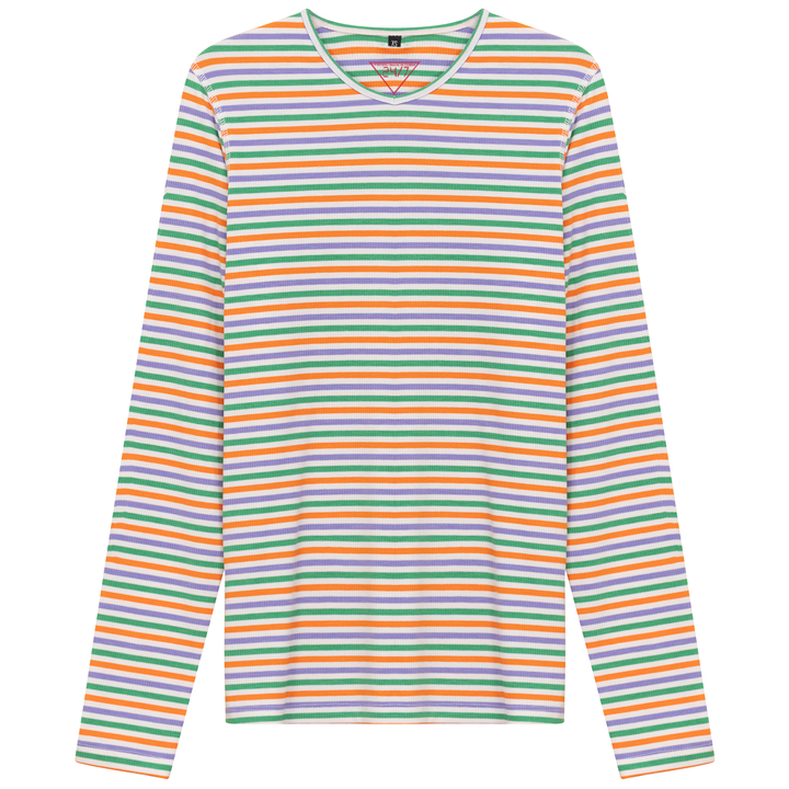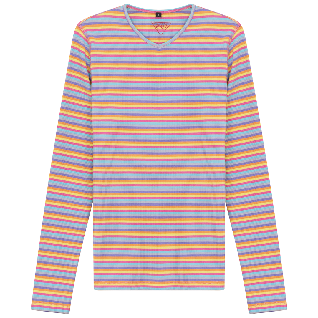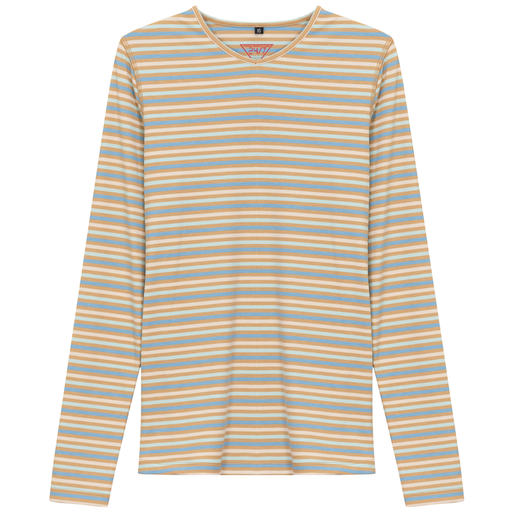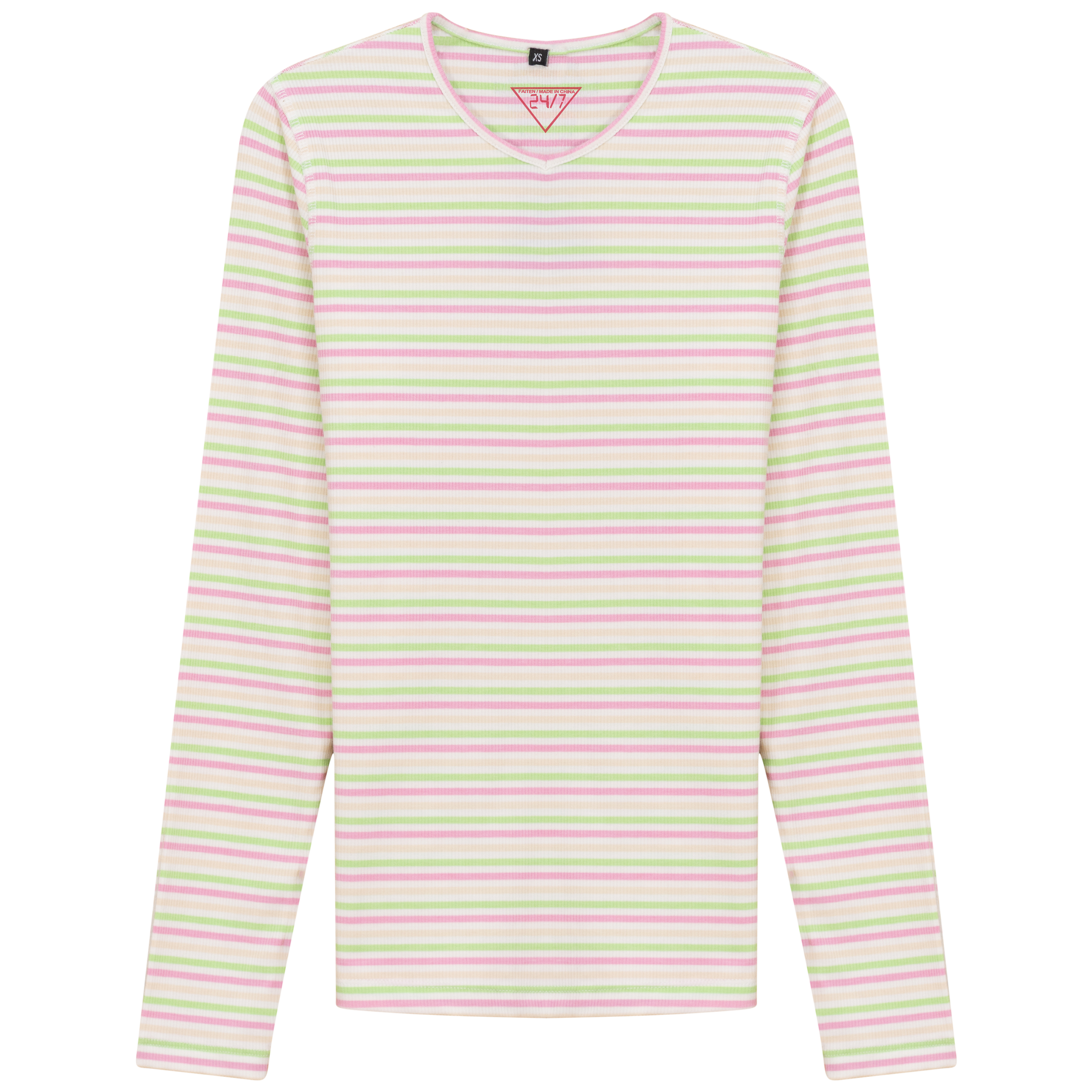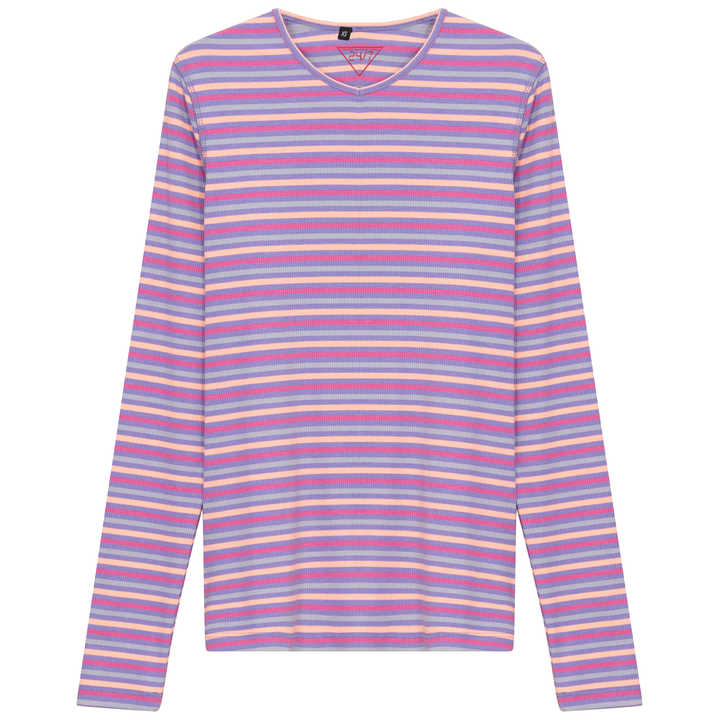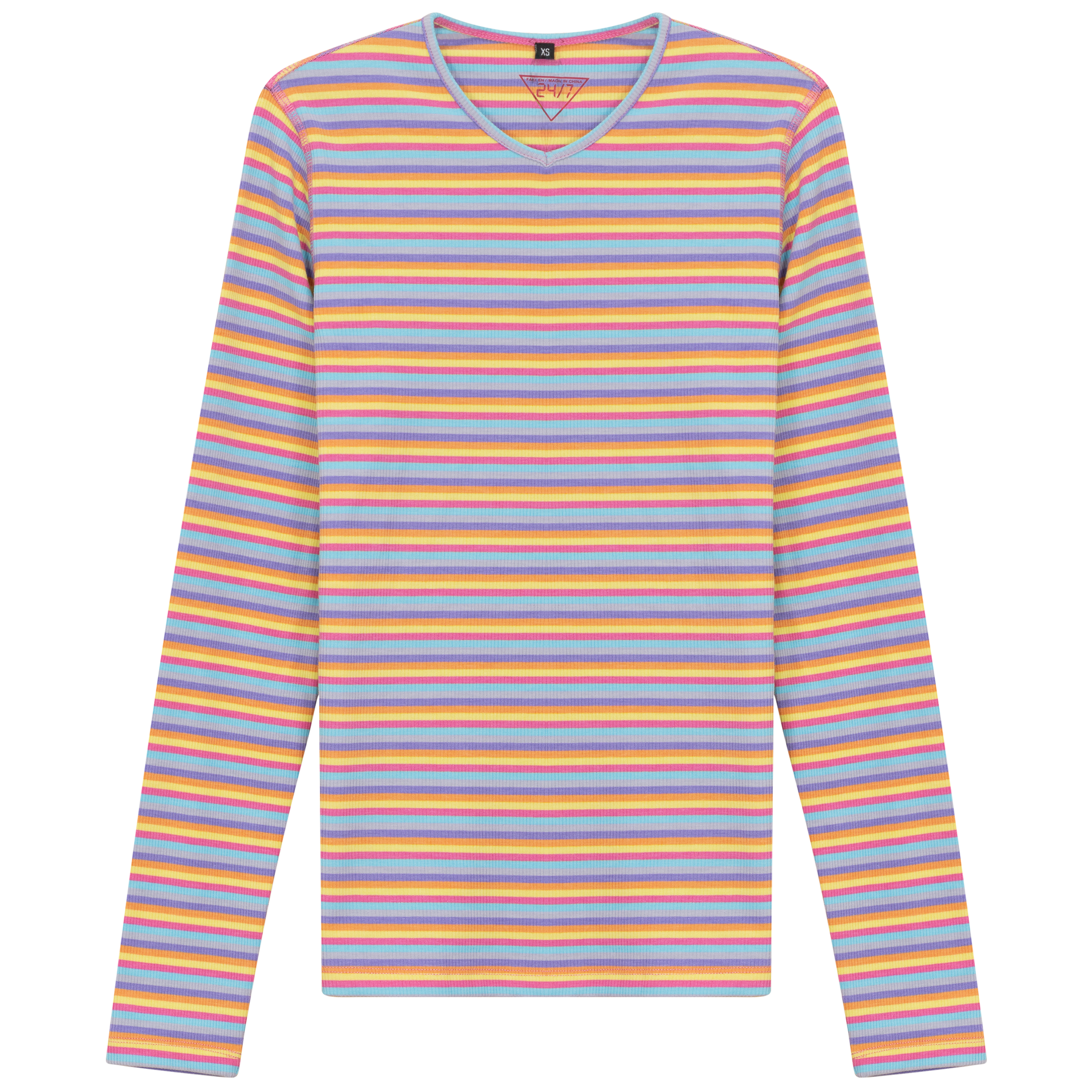 Ladies long sleeve stripped ribbed v neck top.ֲAvailable in the following colors:
