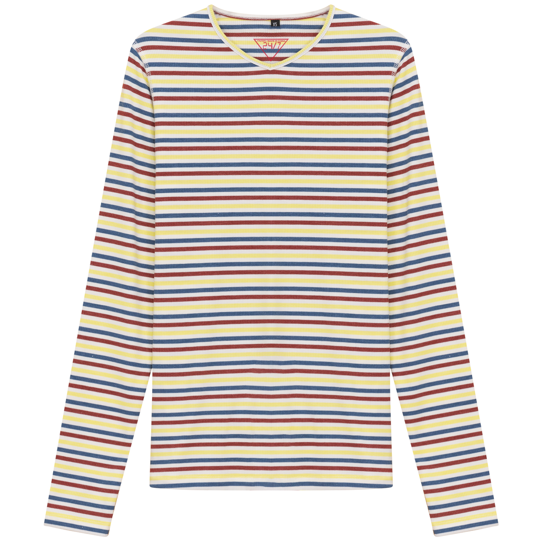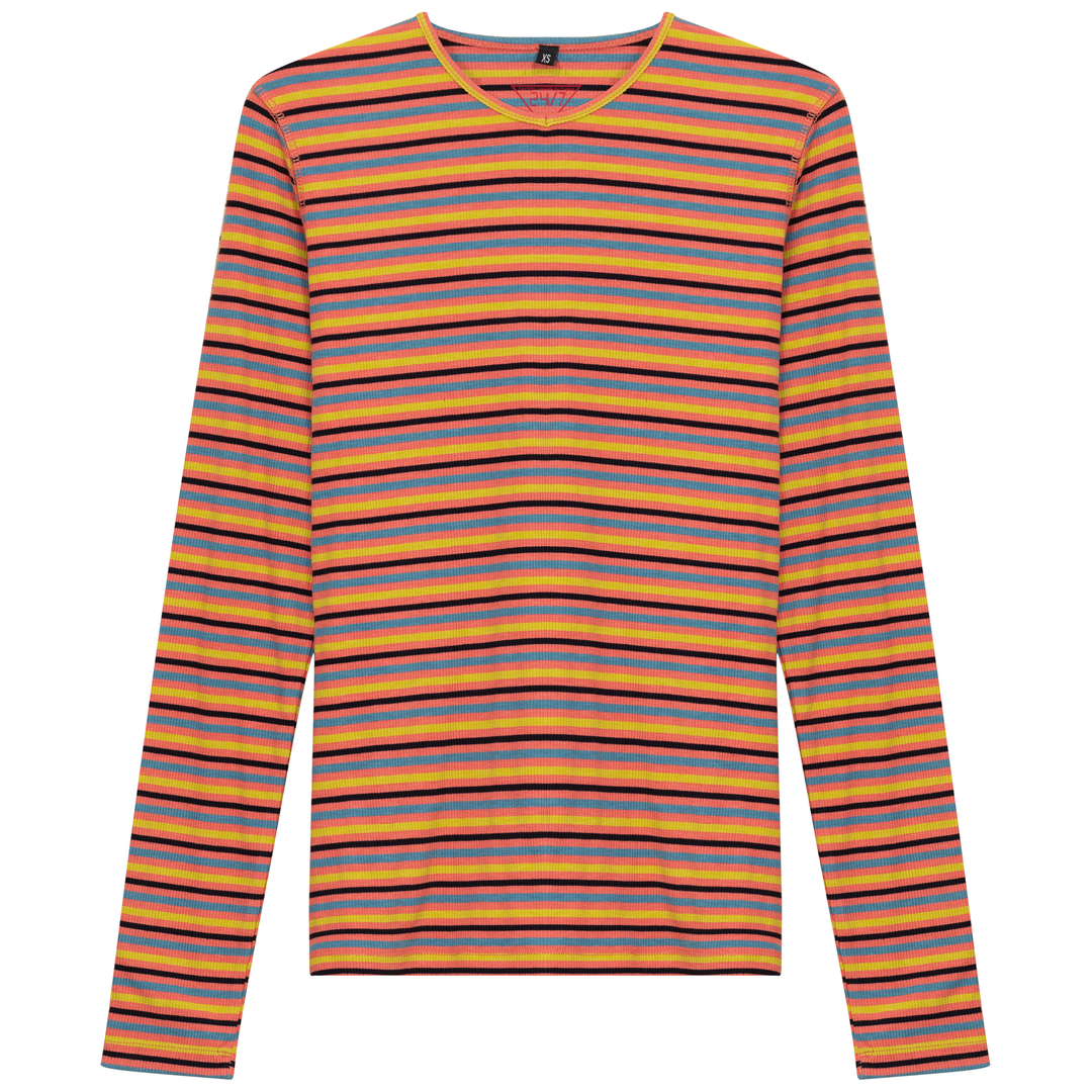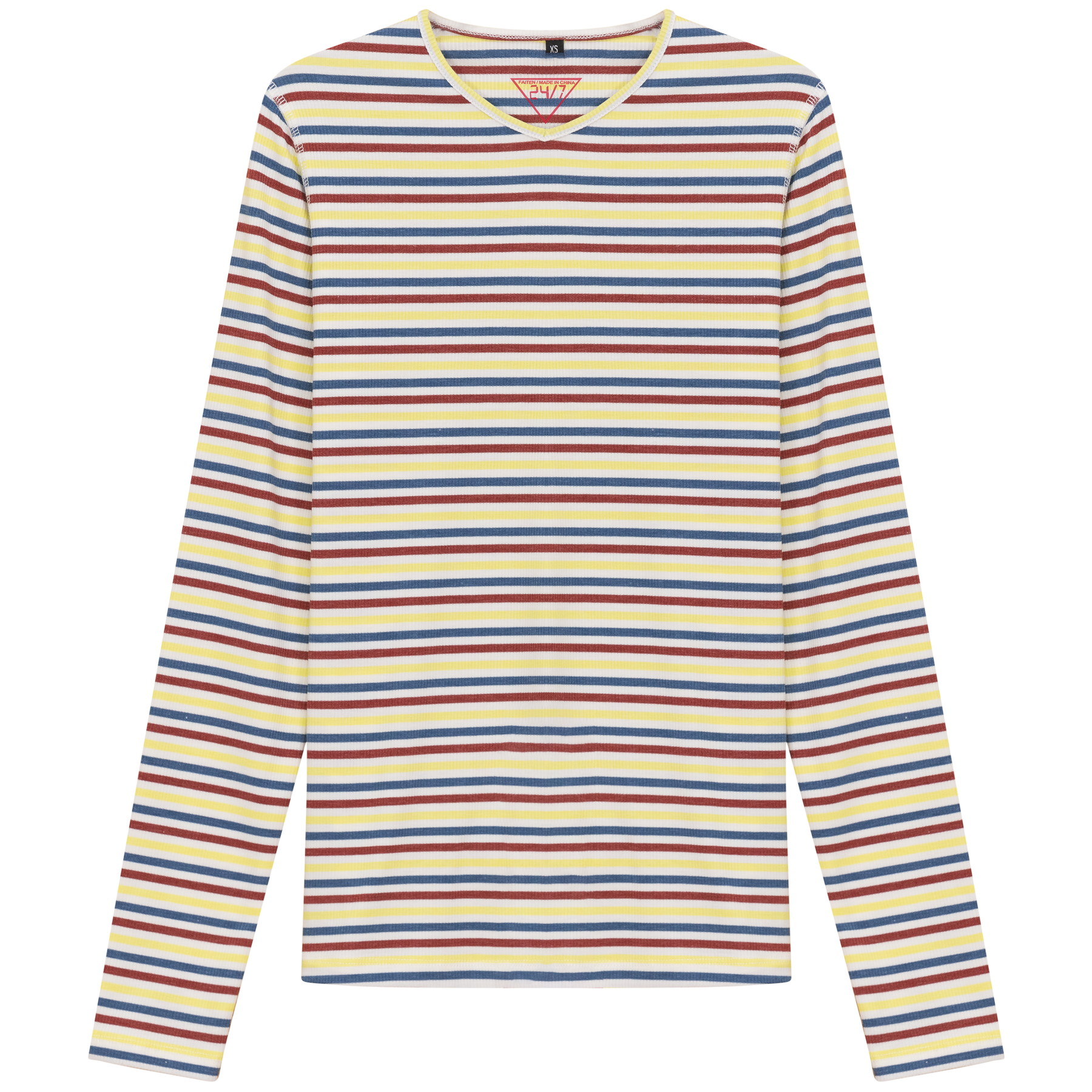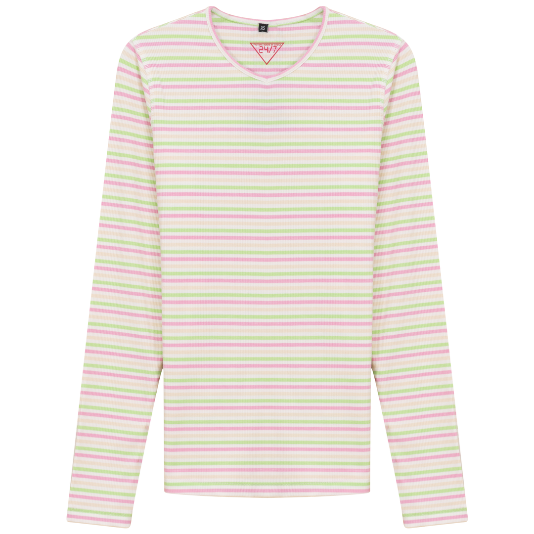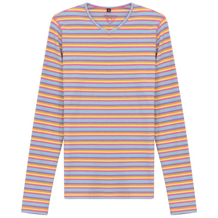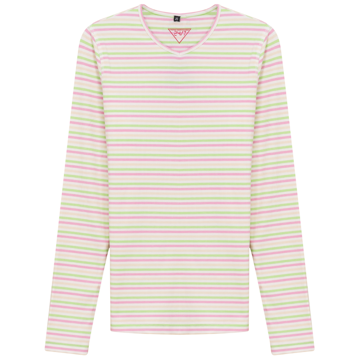 Ladies long sleeve stripped ribbed v neck top.ֲAvailable in the following colors: