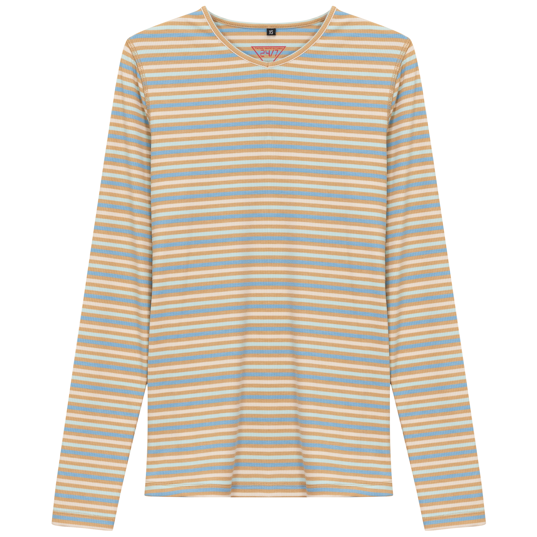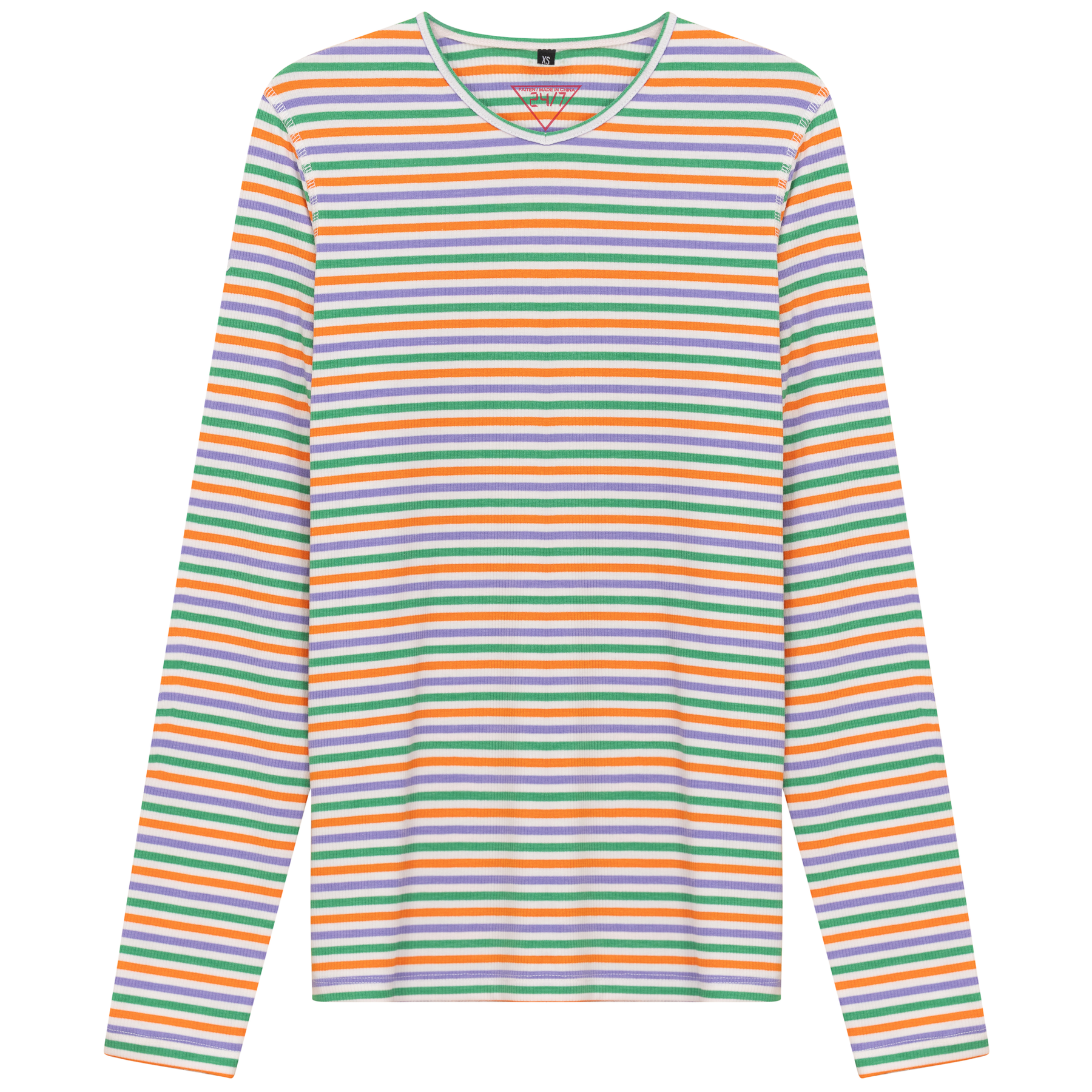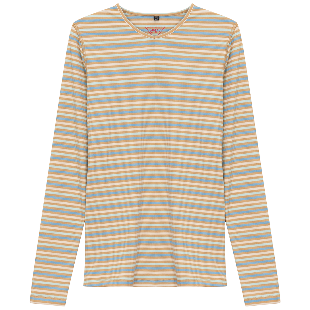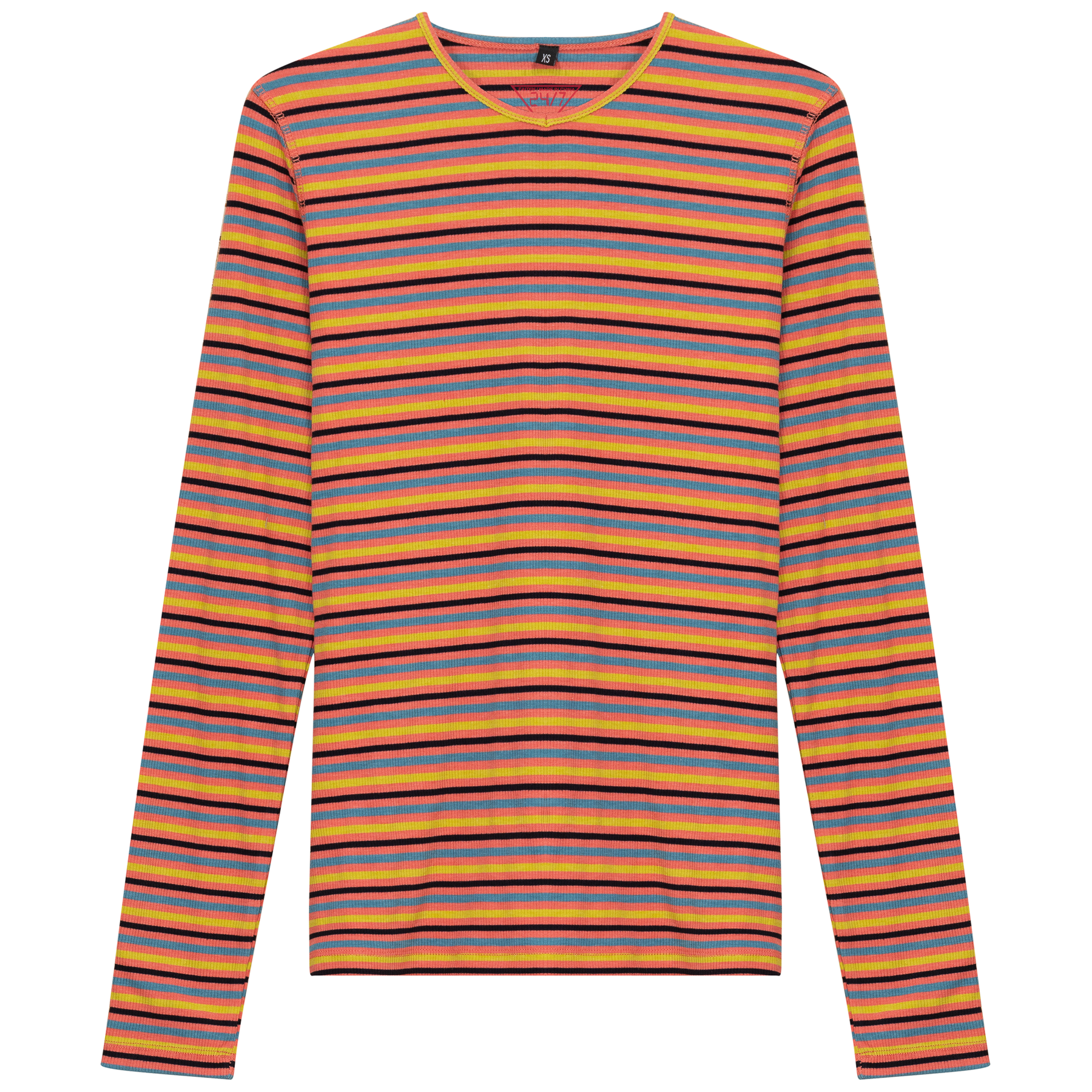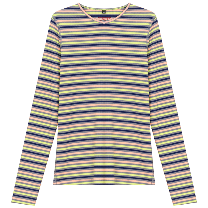 Ladies long sleeve stripped ribbed v neck top.ֲAvailable in the following colors: