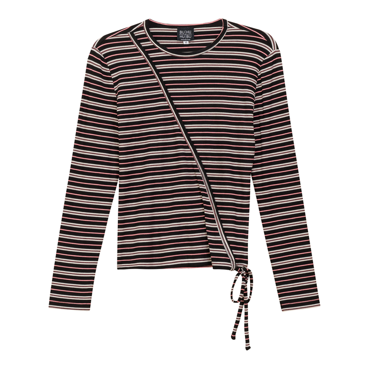 Ladies long sleeve striped ribbed fake wrap tie top.ֲAvailable in the following colors: