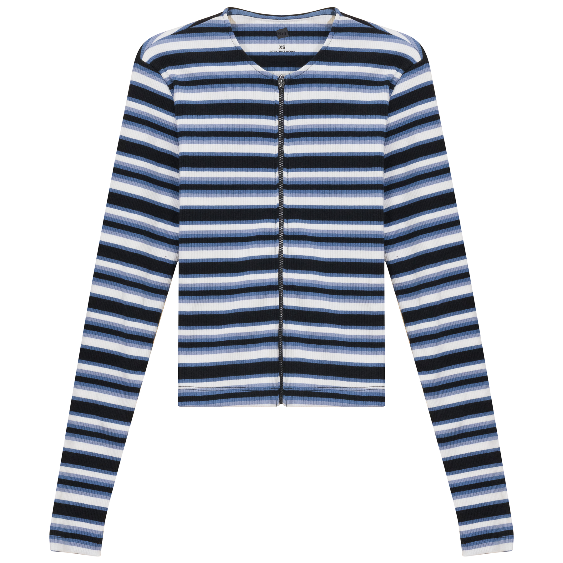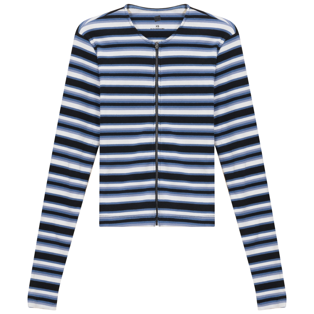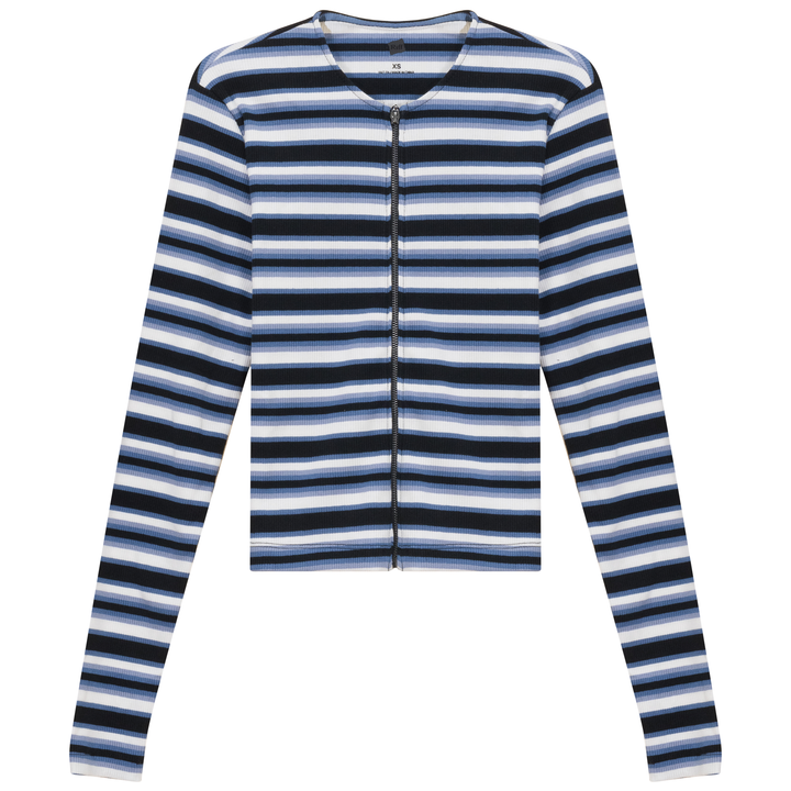 Ladies long sleeve stripped top with center front zipper opening. ֲAvailable in the following color:Denim-BlackCompos...