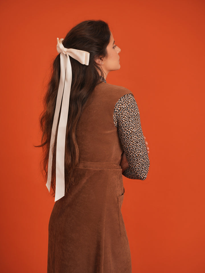 Teens suede jumper with stopper cord at waist , center back invisible zipper and patch pockets at front. ֲ