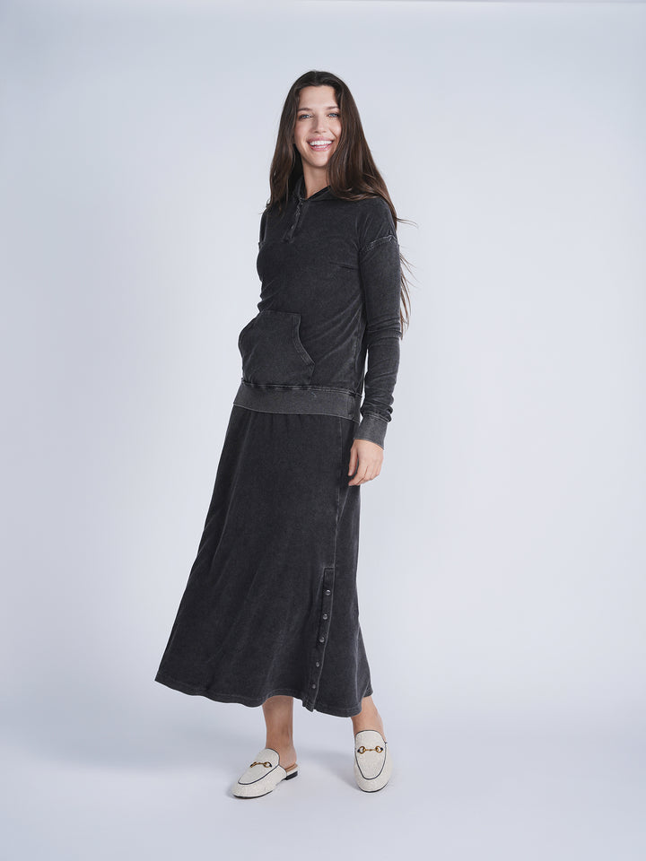 Teens terry 2 piece set. Long sleeve top with with hood,center front metal snap closure,kangaroo pockets and ribbed cuffs and hemband. Matching skirt with covered elastic waistband,bungee cord through waistline and side bottom snap opening.ֲ