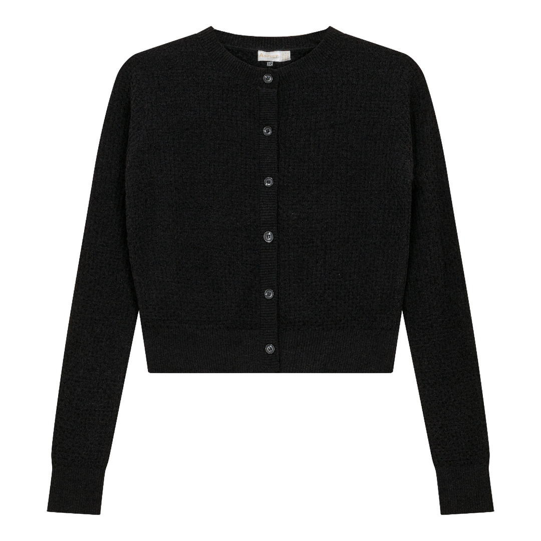 Teens long sleeve textured knit crop cardigan with center front button opening and ribbed cuffs and hemband. ֲ