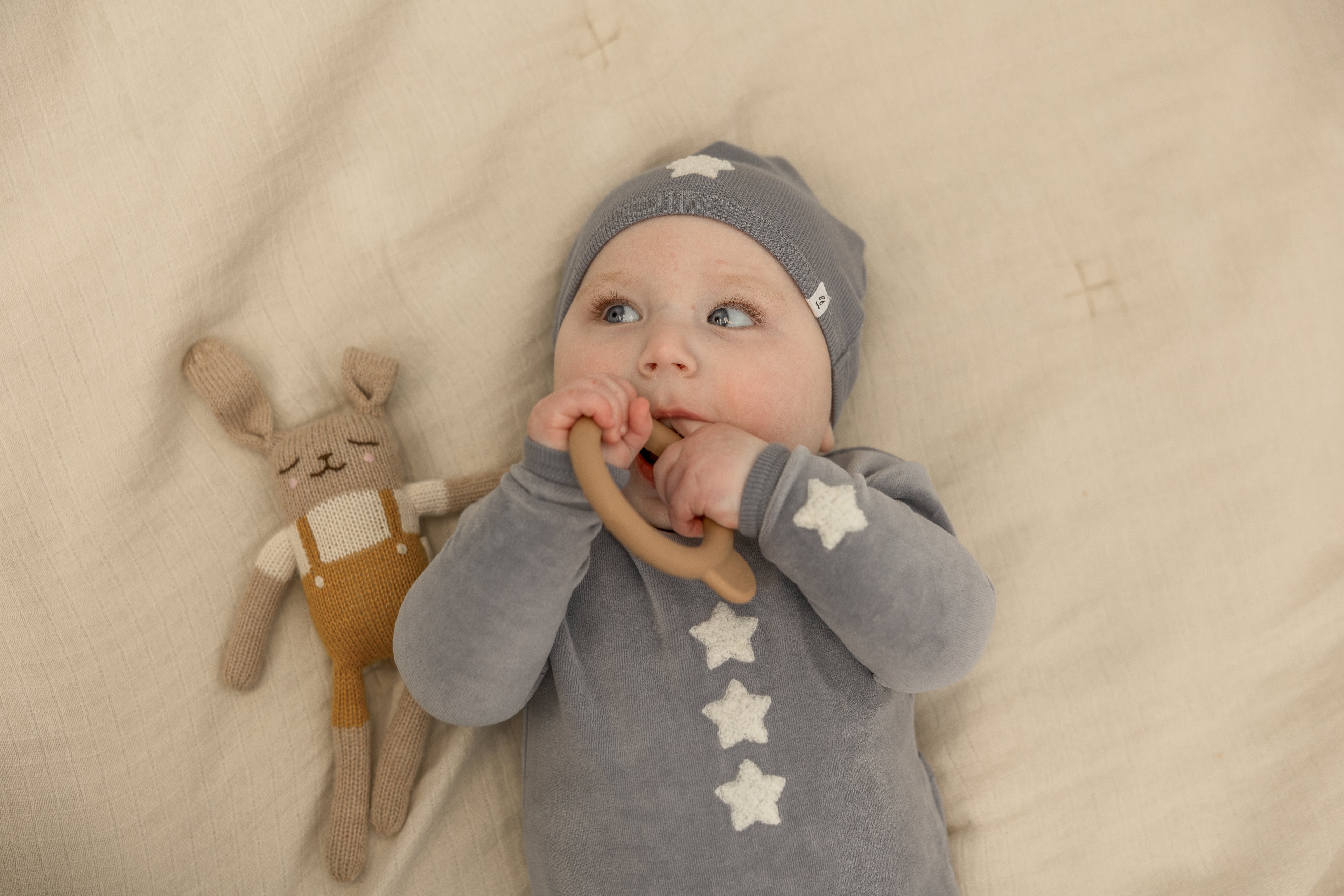 Baby boys and baby girls cotton velour 2 piece set. Long sleeve velour onesie with hook stitch star and heart at center front,center back snap opening and elastic at back ankle. Matching hat. ֲ