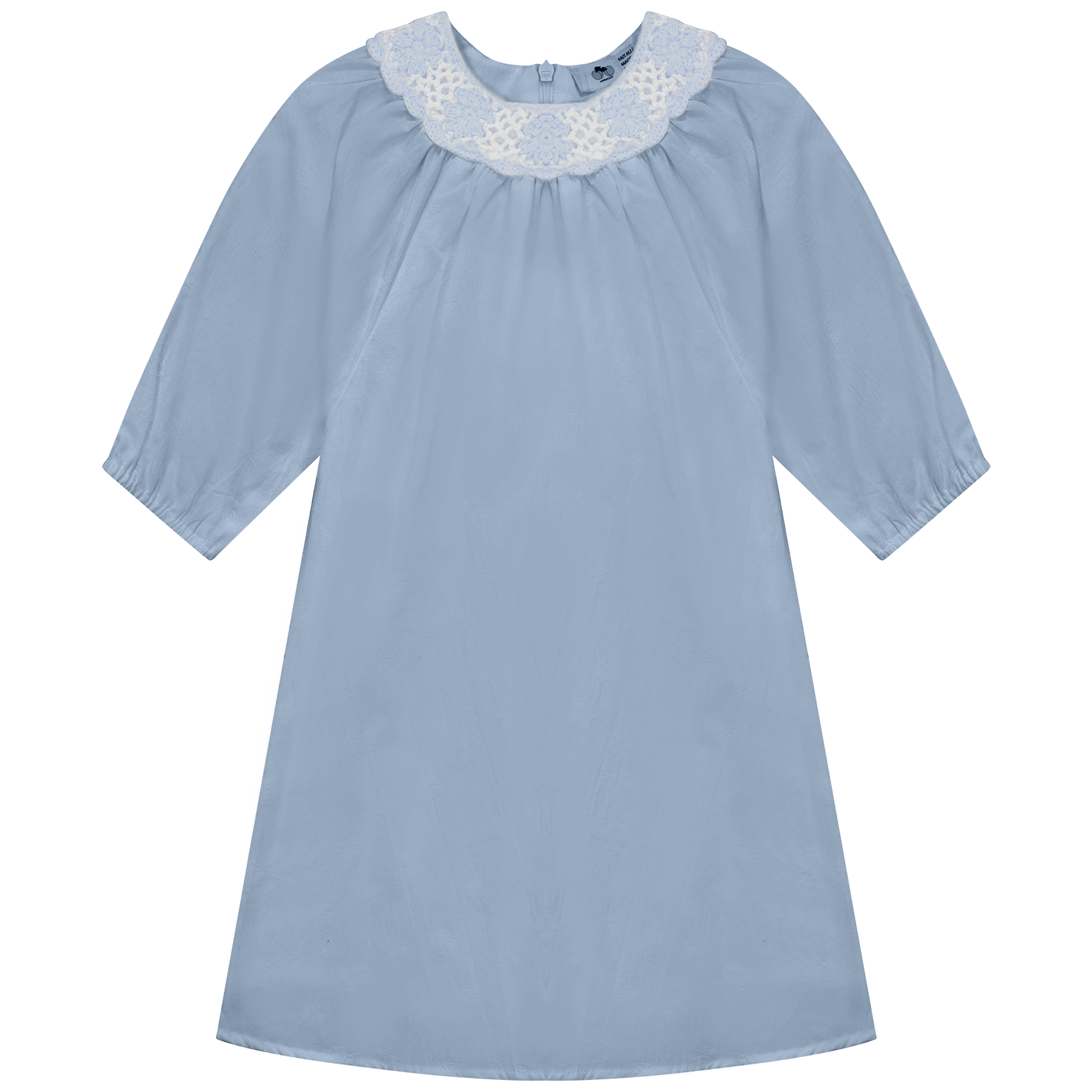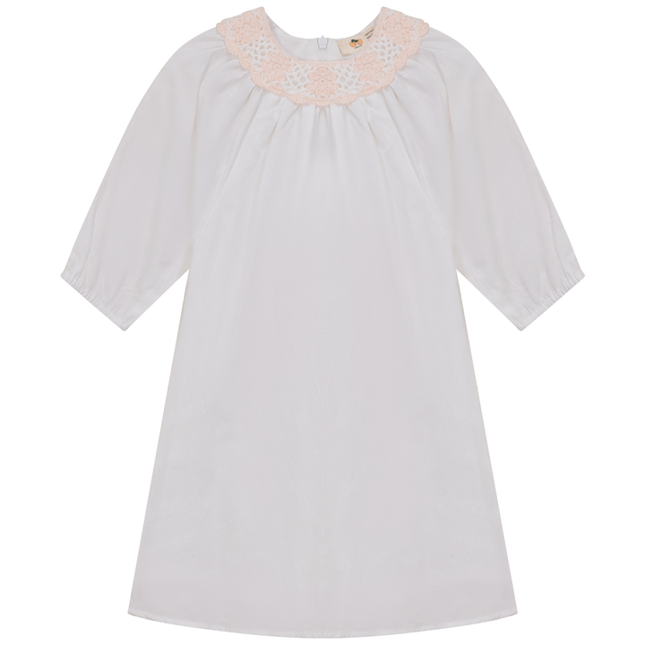 Girls woven cotton dress with crochet neckline and center back invisible zipper.3/4 sleeves size 4 and up.ֲ