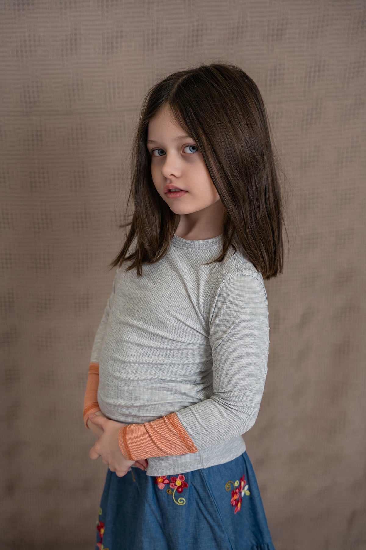 Girls woven denim skirt with all over flower embroidery, covered elastic waistband and tie cord at center waist. ֲ