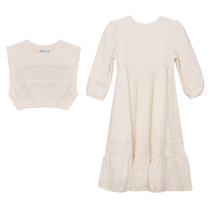 Girls eyelet woven dress with ruffle at bottom and center back invisible zipper closure. Matching removable crochet vest with scallop edge ribbed neckband and arm opening. 3/4 sleeves from size 4 and up. ֲ