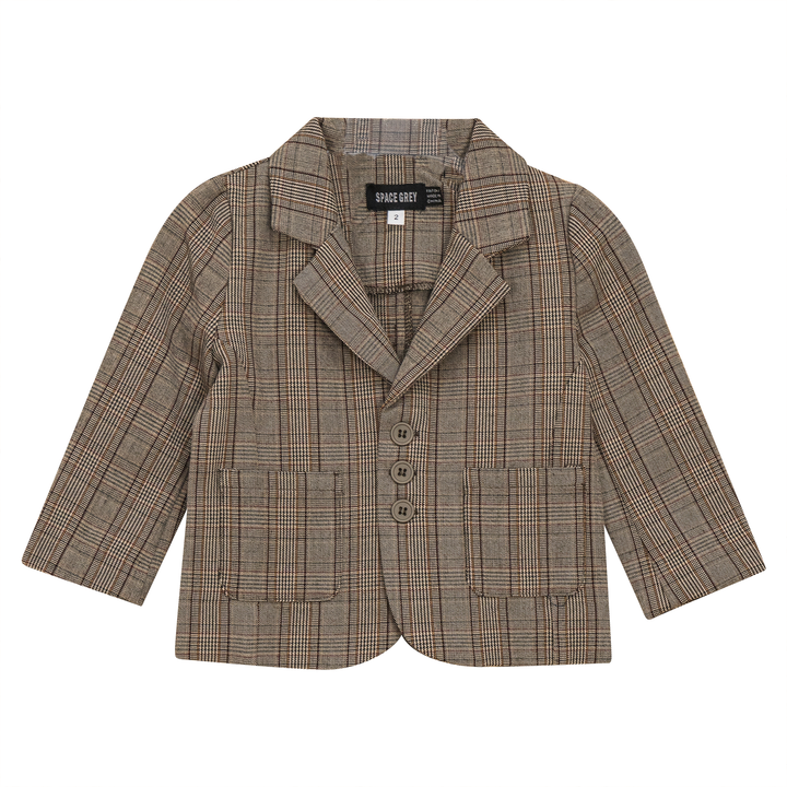 Boys woven plaid blazer with center front button closure and patch pockets. ֲ
