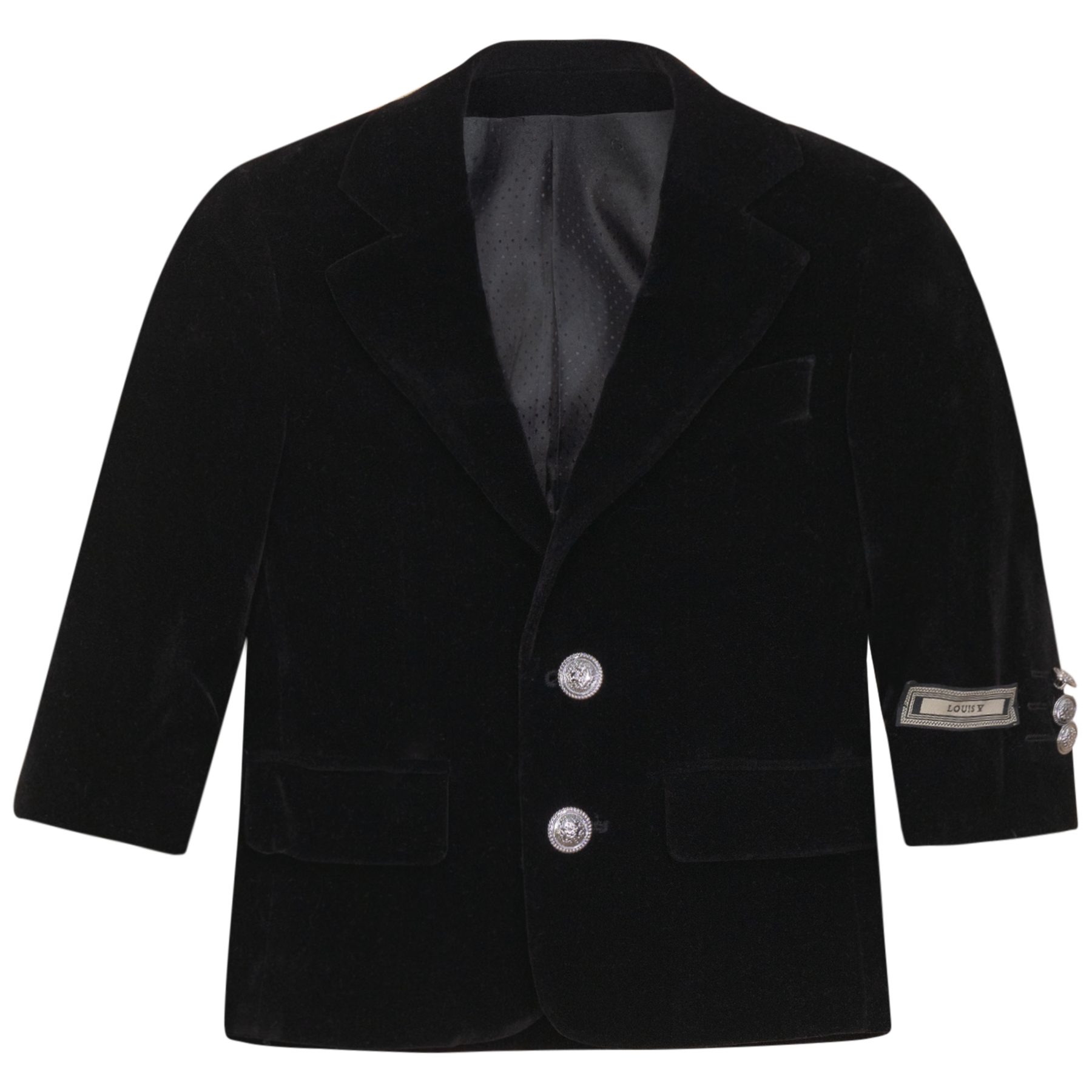Boys long sleeve woven velvet jacket with center front button opening. ֲ