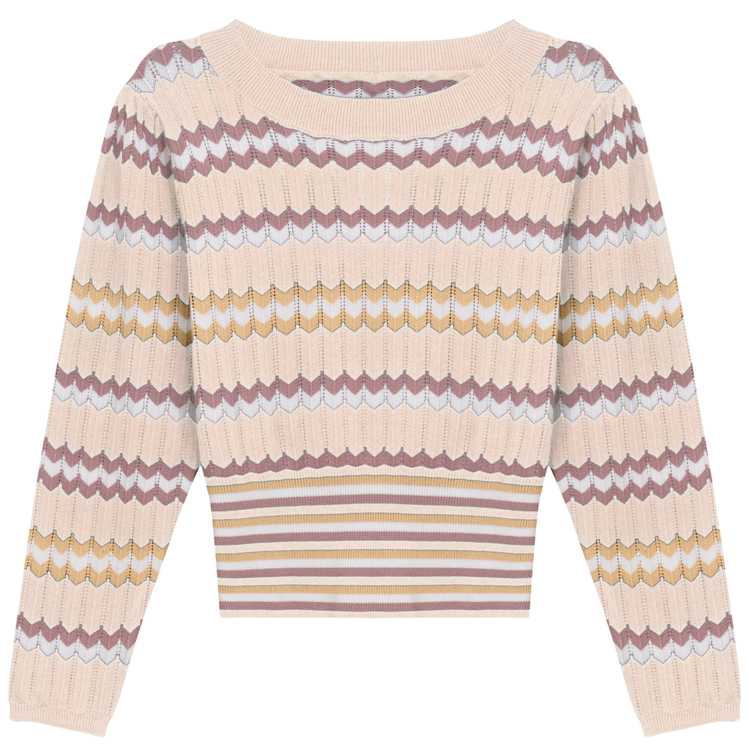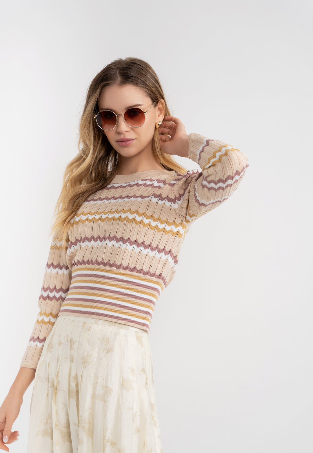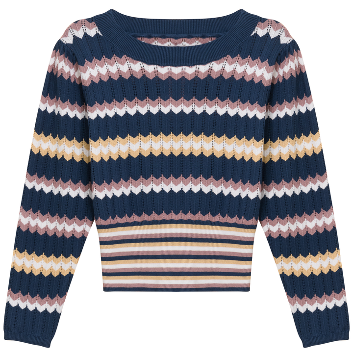 Teens 3/4 sleeved zig zag striped knit sweater with wide stripped hemband.ֲ