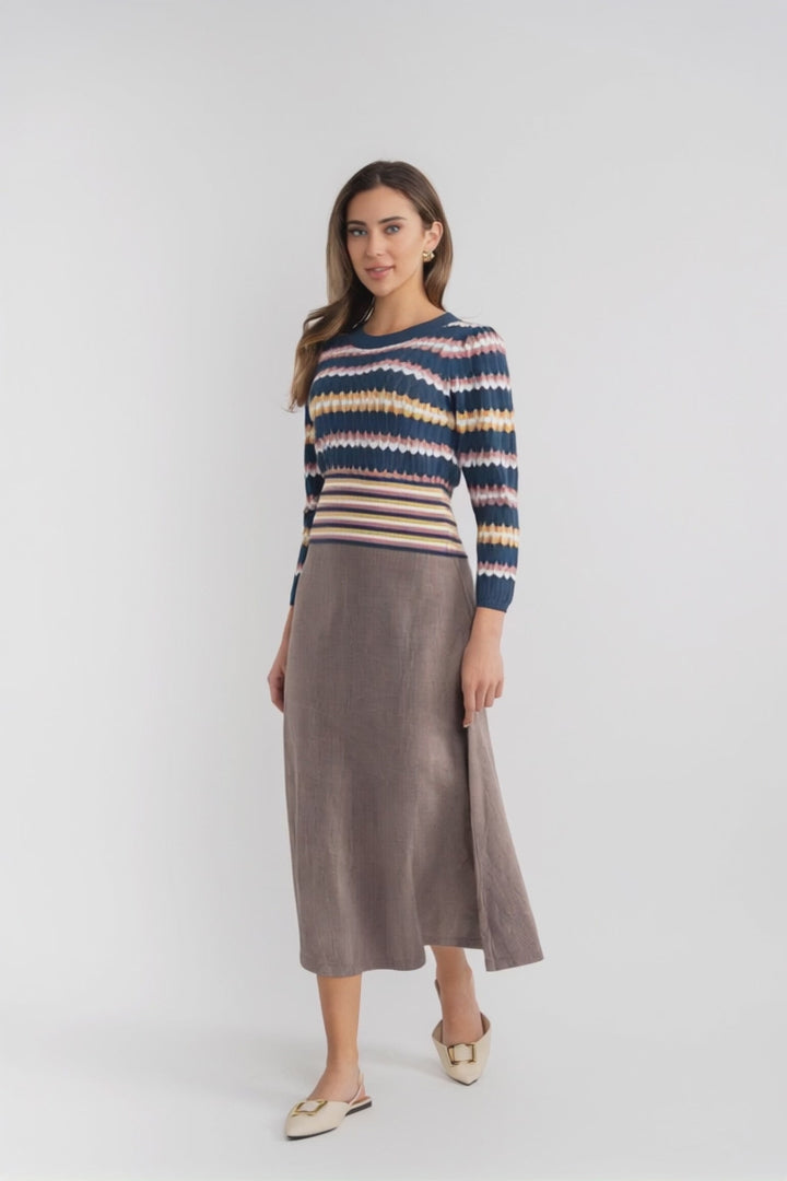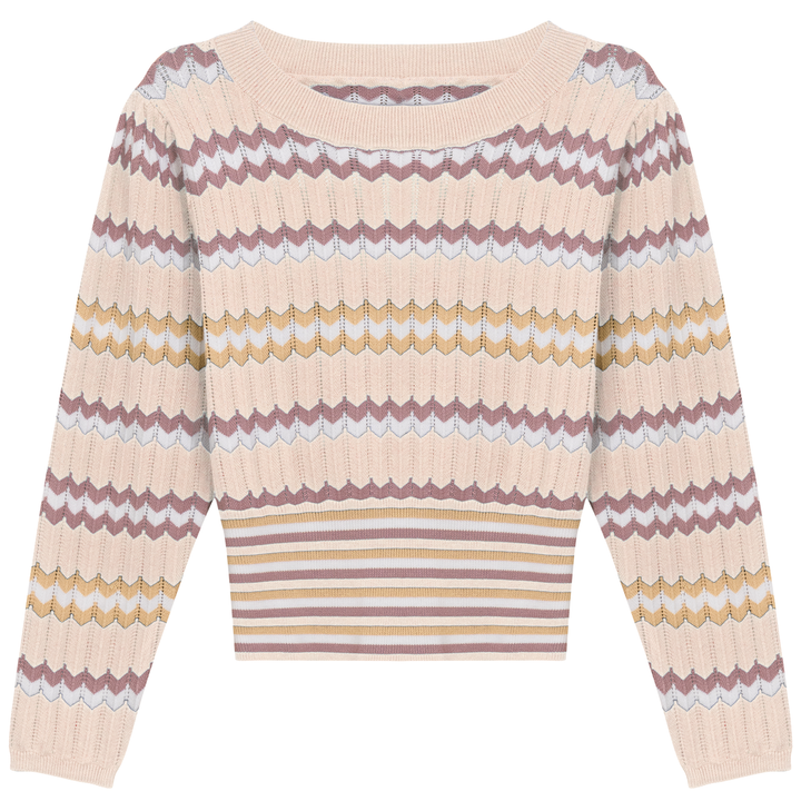 Teens 3/4 sleeved zig zag striped knit sweater with wide stripped hemband.ֲAvailable in the following colors: